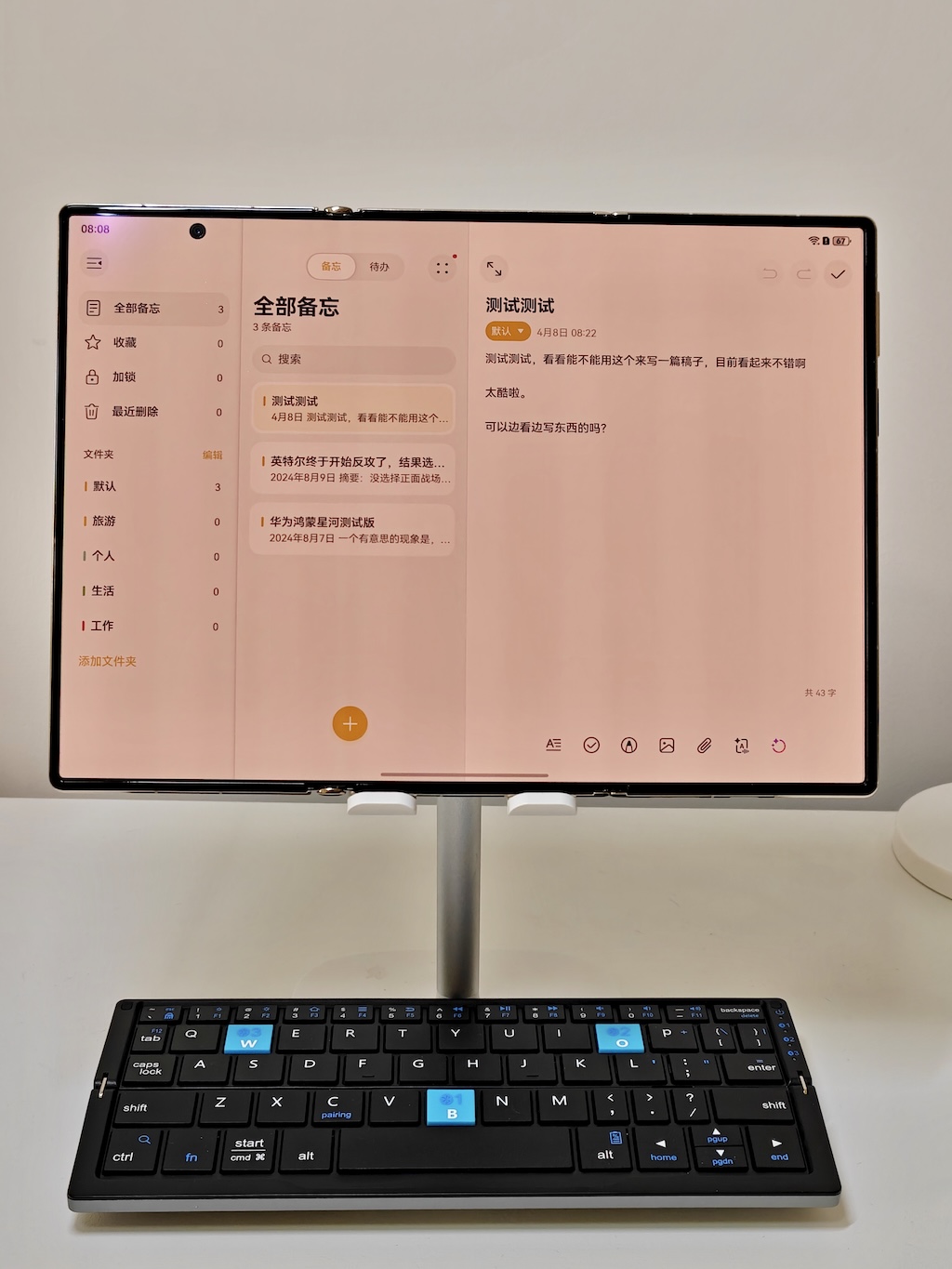之前自費(fèi)購(gòu)買(mǎi)的便攜藍(lán)牙鍵盤(pán)+華為 Mate XTs 就變成了辦公套裝|圖片來(lái)源:極客公園
